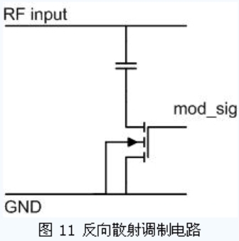 無(wú)源UHF RFID 標(biāo)簽一般采用反向散射的調(diào)制方法,即通過改變芯片輸入阻抗來改變芯片與天線間的反射系數(shù),從而達(dá)到調(diào)制的目的。一般設(shè)計(jì)天線阻抗與芯片輸入阻抗使其在未調(diào)制時(shí)接近功率匹配,而在調(diào)制時(shí),使其反射系數(shù)增加。常用的反向散射方法是在天線的兩個(gè)輸入端間并聯(lián)一個(gè)接有開關(guān)的電容,如圖11 所示,調(diào)制信號(hào)通過控制開關(guān)的開啟,決定了電容是否接入芯片輸入端,從而改變了芯片的輸入阻抗。