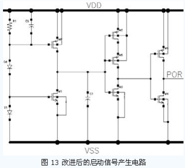通常,無(wú)源RFID 標(biāo)簽進(jìn)入場(chǎng)區(qū)后,電源電壓上升的時(shí)間并不確定,有可能很長(zhǎng)。這就要求設(shè)計(jì)的啟動(dòng)信號(hào)產(chǎn)生電路產(chǎn)生啟動(dòng)信號(hào)的時(shí)刻與電源電壓相關(guān)。圖12 所示是一種常見的啟動(dòng)信號(hào)產(chǎn)生電路。