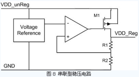 另外一類穩(wěn)壓電路的原理則是采用串聯(lián)式的穩(wěn)壓方案。它的原理圖如圖8 所示。參考電壓源是被設(shè)計(jì)成一個(gè)與電源電壓無(wú)關(guān)的參考源。輸出電源電壓經(jīng)電阻分壓后與參考電壓相比較,通過運(yùn)算放大器放大其差值來控制M1 管的柵極電位,使得輸出電壓與參考源基本保持相同的穩(wěn)定狀態(tài)。