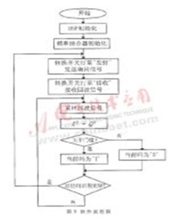 軟件流程如圖5所示。系統(tǒng)開始工作后,DSP初始化,F(xiàn)PGA配置頻率綜合器ADF4127L,產(chǎn)生精準的頻率源。詢問機轉(zhuǎn)換開關指向發(fā)射位置,發(fā)射單元發(fā)射詢問脈沖信號,經(jīng)過一段時間后,開關指向接收位置,接收單元接收回波信號,先進行A/D采樣,并將I路和Q路的采樣值平方相加,若大于編碼門限,則判定當前碼為1,否則為0。一幀32位識別碼判別完后,詢問單元重新發(fā)出詢問信號,如此循環(huán)。解調(diào)出的識別碼通過串口送給外部設備,以供處理。