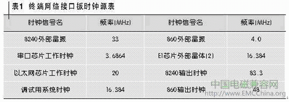 因為終端網(wǎng)絡(luò)接口板上沒有412.5 MHz和577.5 MHz這兩個頻率信號,所以懷疑這兩個頻點可能是某些頻率信號的諧波分量。高速電路中,時鐘電流是第一輻射源。筆者對終端網(wǎng)絡(luò)接口板上的各時鐘信號進行了統(tǒng)計,如表1所示。
