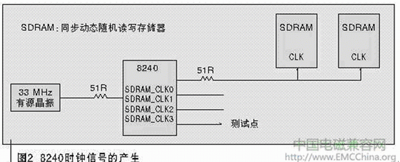 圖2所示為8240時鐘信號的產(chǎn)生原理圖。8240外部有源晶振產(chǎn)生33 MHz的振蕩頻率,送入8240芯片,經(jīng)內(nèi)部PLL(鎖相環(huán))鎖相倍頻,輸出83.3 MHz頻率,作為SDRAM(同步動態(tài)隨機讀寫存儲器)的工作時鐘,8240有4個引腳可以同時送出該83.3 MHz的時鐘:SDRAM_CLK0~SDRAM_CLK3,而且可以在8240內(nèi)部寄存器中設(shè)置開關(guān)。該單板在電路設(shè)計時,使用SDRAM_CLK0作為SDRAM工作時鐘,另一路SDRAM_CLK3送至一測試點,方便調(diào)試時測量時鐘信號,其余2路設(shè)置為關(guān)閉狀態(tài),不對外輸出時鐘。