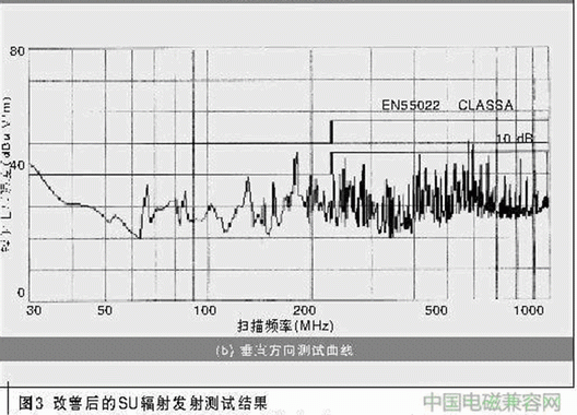 筆者用高速示波器測量出網(wǎng)絡(luò)接口板的工作地噪聲(Vp-p)為96 mV,中頻板工作后,噪聲增至130 mV以上。此測量方法可能存在偏差,但總體的趨勢是2塊單板同時工作后,的確增加了地線噪聲,對EMI有一定的影響,只不過影響是有限的。