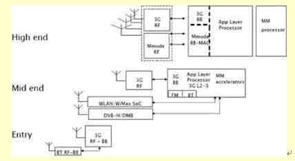 隨著多種無線技術標準在便攜無線設備中獲得應用,客觀上要求便攜式無線設備以有成本效益的方式支持多個頻段以及多種不同的調制方式。業(yè)內專家認為[1],目前多種無線標準在便攜式無線設備中的聚合將遵循入門級、中檔和高檔三種技術方案(圖1),采用CMOS數字無線電技術和可配置無線電技術是將來最終的解決方案。