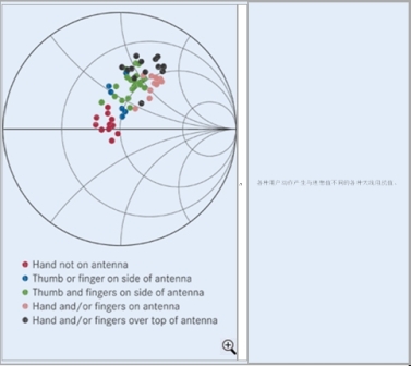 圖6:天線的阻抗變化(圖中文字:各種用戶動作產生與理想值不同的各種天線阻抗值)
