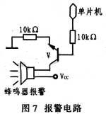 顯示電路采用4位共陽LED數(shù)碼管,碼段由74LS244驅(qū)動電路驅(qū)動;驅(qū)動電路由PNP晶體管8550驅(qū)動。圖7給出報警電路。它采用晶體管驅(qū)動。