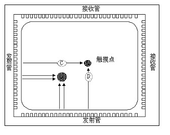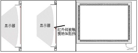 紅外觸摸屏是在緊貼屏幕前密布X、Y方向上的紅外線矩陣,通過(guò)不停的掃描是否有紅外線被物體阻擋檢測(cè)并定位用戶(hù)的觸摸。如下圖所示,這種觸摸屏是在顯示器的前面安裝一個(gè)外框,外框里設(shè)計(jì)有電路板,從而在屏幕四邊排布紅外發(fā)射管和紅外接收管,一一對(duì)應(yīng)形成橫豎交叉的紅外線矩陣。每掃描完一圈,如果所有的紅外對(duì)管通達(dá),綠燈亮,表示一切正常。