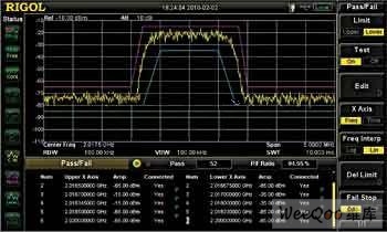 對于問題三可以利用DSA1030A頻譜分析儀中的Pass/Fail功能來解決。用戶根據(jù)實(shí)際的需求提前編輯好兩條標(biāo)準(zhǔn)跡線即測量的上限和下限,開啟該功能后會對測量結(jié)果進(jìn)行統(tǒng)計(jì)通過率。在測量失敗的時(shí)候會自動停止測量,查看測量失敗的頻率和幅度。如圖3所示,利用Pass/Fail功能監(jiān)控信號的大小。