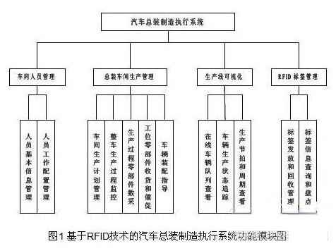 基于RFID技術(shù)的汽車(chē)總裝制造執(zhí)行系統(tǒng)功能模塊主要分為車(chē)間生產(chǎn)管理、生產(chǎn)線可視化、RFID標(biāo)簽管理、車(chē)間人員管理等四個(gè)功能模塊,具體功能結(jié)構(gòu)如圖1 所示: