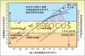 圖2所示為熱電堆單元和二極管檢測器的響應(yīng)。傳統(tǒng)的二極管檢測器要么工作在平方律區(qū)域,因此動態(tài)范圍被限制為50dB;要么采用線性校正技術(shù)來擴(kuò)展它們的動態(tài)范圍。這種技術(shù)受到功率計速度的限制,并且不適合于系統(tǒng)傳輸?shù)姆柭蔬h(yuǎn)遠(yuǎn)超過功率計采樣率的應(yīng)用。