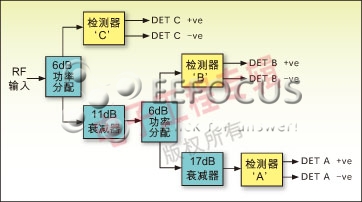 對于檢測器A的路徑,有40dB的衰減;如果輸入功率在+20dBm到-3.5dBm的范圍內(nèi),就要選擇該檢測器。因此,在二極管上的信號電平的變化范圍從-20dBm到-43.5dBm。檢測器B具有23dB的衰減,如果輸入功率的范圍在-3.5dBm到-23.5dBm之間,就要選擇該檢測器。在二極管上的信號電平的變化范圍從-26.5dBm到46.5dBm。