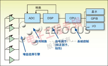 這是一個現(xiàn)代功率計的典型方框圖。輸入信號被放大后,經(jīng)過模數(shù)轉(zhuǎn)換,然后,由DSP處理。在傳統(tǒng)的功率計中,放大器的每一個量程的設(shè)置通常采用十倍量程。對寬動態(tài)范圍功率傳感器的需求已經(jīng)導(dǎo)致要采用動態(tài)范圍更大的模數(shù)轉(zhuǎn)換器,并且各量程的覆蓋范圍通常大于10dB。
