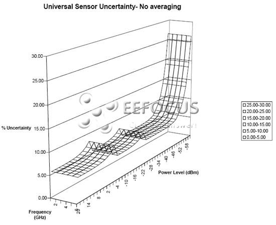 該圖顯示了熱電堆傳感器在其整個工作頻率范圍內(nèi)的不確定性表面。在該情形下,信號源匹配一直固定在1.2,所以由于不匹配引起的不確定性被減小了。不確定性已經(jīng)被當(dāng)作RSS項疊加。在低功率電平上不確定性的增加主要是由零位調(diào)整參數(shù)引起的。這種與頻率相關(guān)的紋波是因在整個范圍內(nèi)變化的校正因子的不確定性引起的。