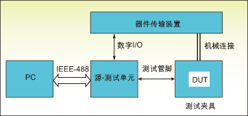 我們的第一個例子包括測試儀器、器件傳遞裝置(handler)和PC(圖1),這里需要注意如何通過內(nèi)部編程來消除大多數(shù)的GPIB通訊來加速測試。