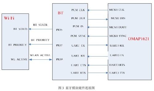 AFH技術(shù)在上面已經(jīng)介紹過(guò)了,單獨(dú)使用AFH技術(shù)使用藍(lán)牙耳機(jī)的通話效果不是很好,為了解決這種問(wèn)題,在使用AFH技術(shù)的基礎(chǔ)上又使用了三線共存(時(shí)分復(fù)用)技術(shù)。三線共存,顧名思義,就是使用三根線連接Wi-Fi和藍(lán)牙,下面結(jié)合圖3中Wi-Fi和藍(lán)牙所示的三線連接圖來(lái)描述一下三線共存的機(jī)制,其中主處理器使用的是TI公司的OMAP1621芯片。
