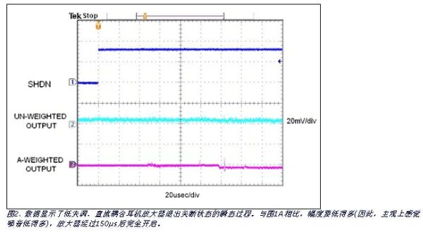 第二種瞬變過程,即直流耦合耳機(jī)放大器(圖2),似乎淹沒在A加權(quán)濾波之前示波器的噪聲底中。對(duì)于這種放大器,大部分音頻來自從關(guān)斷到完全工作時(shí)產(chǎn)生的直流失調(diào)電壓。由于失調(diào)只有幾個(gè)毫伏,沒有經(jīng)過濾波的信號(hào)不能精確決定咔嗒聲的大小。采用A加權(quán)濾波后,從噪聲基底中提取出直流耦合耳機(jī)放大器失調(diào)產(chǎn)生的咔嗒聲,獲得更客觀的測(cè)量結(jié)果。 (注意,沒有顯示濾波后的信號(hào)標(biāo)度V/div。)