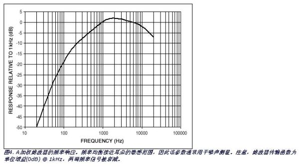下一步,選擇分析儀的A加權(quán)濾波(建議)或非加權(quán)22Hz至22kHz濾波器,將測(cè)量帶寬限制在音頻范圍內(nèi)。請(qǐng)注意,示波器的快速高電平瞬變并不表明有多少能量出現(xiàn)在音頻頻帶內(nèi)。人耳對(duì)揚(yáng)聲器或耳機(jī)瞬變信號(hào)的頻率響應(yīng)很有限。因此,增加A加權(quán)濾波(圖4)更有利于分析,因?yàn)檫@樣增強(qiáng)了人耳敏感的頻率分量。某些音頻分析儀不能選用A加權(quán),這種情況下,應(yīng)限制人耳頻率響應(yīng)的帶寬。音頻測(cè)試設(shè)備中常用的限制帶寬是22Hz至22kHz,帶寬限制濾波器大概能達(dá)到20kHz的平坦響應(yīng)(通常為人耳的上限)。