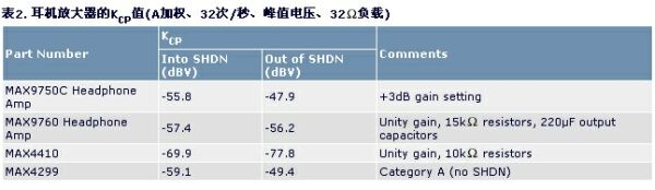 在很多應(yīng)用中,盡管許多因素會(huì)影響可接受咔嗒聲電平的建立,我們還是可以規(guī)定一個(gè)可信的指標(biāo)基準(zhǔn)。注意,Maxim耳機(jī)放大器B類咔嗒聲的測(cè)試結(jié)果(表2),所有測(cè)試均采用一個(gè)32負(fù)載電阻,每一KCP值代表每個(gè)端口四次采樣的平均值。