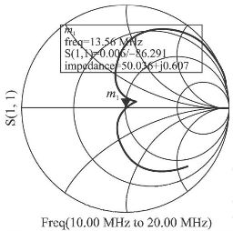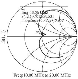手動調(diào)諧即是交替不斷調(diào)整電容C1、C2 的值,同時觀察曲線變化,直到在所要求的頻率點S11等于0。圖2為某一天線電路在頻率在10~20MHz之間變化時,其反射系數(shù)的變化曲線,其中,標記13. 56MHz的點, S11值近似為0,達到了匹配要求。