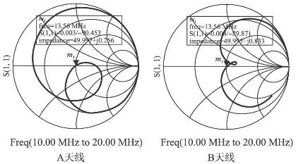 在載波頻率為13. 56 MHz時,通過在TX1 和TX2 兩點測量天線線路的反射系數(shù)(即參數(shù)S11 )來手動調(diào)諧,直到天線電路的輸入阻抗達到目標,計算方程如下:
