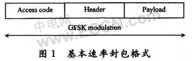藍(lán)牙v1.2基帶數(shù)據(jù)封包中包含了存取碼、標(biāo)頭、保護(hù)時段(guard band)和負(fù)載(payload),如圖1所示?;舅俾收{(diào)變指的是GFSK,數(shù)據(jù)會以每個符號攜帶一個位元的方式,在1 Mb/s的資料速率下進(jìn)行傳輸,因此符號速率為1 Ms/s。資料會利用最小115 kHz的載波頻率中的位移或偏差,在RF載波上調(diào)變。高斯脈沖波形將-20 dB的頻寬維持1 MHz,頻譜利用率比BFSK高一倍。