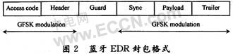 藍(lán)牙v2.0 EDR封包先在存取碼和標(biāo)頭的部分使用GFSK調(diào)變模式,但是,在保護(hù)時間5μs之后,負(fù)載部分則用π/4-DQPSK或8DPSK調(diào)變模式,如圖2所示。在保持指定的1 Ms/s符號速率前提下,增強速率分別提升資料速率到2 Mb/s或3 Mb/s,即每個符號發(fā)射二到三位碼元。通過測試發(fā)現(xiàn)結(jié)果,在封包的GFSK調(diào)變部分振幅顯得相當(dāng)固定,但在DPSK調(diào)變波形中振幅卻有較大的波動。