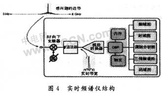 隨著數(shù)字射頻技術(shù)的發(fā)展,要求必須能捕獲并存儲一段時間的信號,并可反復(fù)回放,分析信號隨時間的變化。另外,隨著頻譜利用率不斷提高,干擾將來自更臨近的頻點,甚至同一頻率,這要求頻譜測試技術(shù)在發(fā)現(xiàn)和捕獲能力上實現(xiàn)本質(zhì)性的突破。實時頻譜儀的核心是基于快速傅里葉(FFT)的儀表,可以實時捕獲各種瞬態(tài)信號,同時在時域、頻域及調(diào)制域?qū)π盘栠M(jìn)行全面分析,滿足現(xiàn)代數(shù)字射頻信號測試的需求,圖4所示為簡化的實時頻譜儀結(jié)構(gòu)圖。