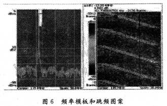 在跳頻情況下,跳頻圖案是否按照設(shè)計的跳頻圖案進(jìn)行偽隨機跳變,將直接影響到跳頻系統(tǒng)的抗干擾性能和整個設(shè)計是否成功,所以需要對跳頻圖案進(jìn)行測試驗證。實時頻譜儀的三維頻譜圖(時間、頻率和幅度)是觀測跳頻圖案的一種非常有效的方式,如圖6所示。由于頻率模板觸圖發(fā)功能的使用,可以使得工程師直接設(shè)定跳頻的起始點來捕獲跳頻信號觀測跳頻圖案,這樣就可以找到特定頻率位置的跳頻圖案。而對于傳統(tǒng)儀器只能隨機捕獲,很可能無法捕獲到關(guān)心的跳頻點位置的跳頻圖案。