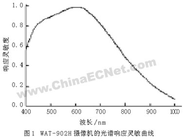 獲得的圖像質(zhì)量直接影響圖像處理程序的復(fù)雜度和檢測結(jié)果。如果采用的光源單色性越好,越接近平行光,則圖片的干涉條紋更清晰,質(zhì)量更好。然而單色激光器或者平行光源體積大,而紅外測試系統(tǒng)的一大特點就是結(jié)構(gòu)簡單、緊湊,而提供窄波段的照明價格比較昂貴,且不易控制,因此選用普通的白熾燈作為光源。為了得到較好的紅外圖片,在鏡頭的上方放置一塊雙面鏡面拋光的硅片,從而過濾掉可見光對圖片的影響。同時,選用超低照度黑白攝像機WAT-902H,它的光譜響應(yīng)靈敏曲線如圖1所示。而紅外線波長為750 nm~1000μm,這樣我們采用普通的光源就可以獲得窄波段的紅外圖像。另外,由于該相機對紅外波段的響應(yīng)靈敏度不高,可以通過增加光強來克服,從而獲得清晰的紅外干涉圖像,為后續(xù)的圖像分析和處理做準備。