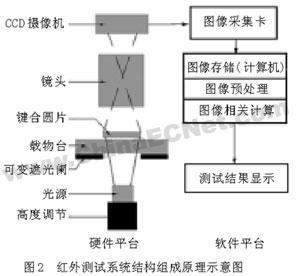 光源通過可變光闌照射到鍵合片,光線透過鍵合片,通過鏡頭,在攝像機上成像,從而獲得鍵合片的紅外圖像,通過數(shù)據(jù)采集卡送入計算機,經(jīng)過圖像處理程序的處理,顯示測試結(jié)果。