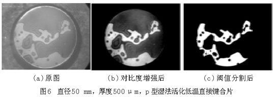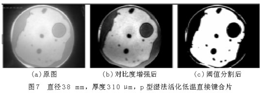 圖6(a)和圖7(a)中,圓形區(qū)域是要鍵合的圓片,其中明區(qū)為鍵合上的地方,暗區(qū)為未鍵合上的地方,圓形區(qū)域(即鍵合圓片)以外為圖像背景。從圖上可以大致地看出空洞(未鍵合區(qū)域)的分布、個數(shù)和大小等。為了獲得更為準確的數(shù)據(jù)信息,借助圖像處理程序?qū)D片(a)進行對比度增強、平滑、分割等一系列處理,可獲得圖(b),(c),從而得到鍵合率。樣品1的鍵合率為28.12%,鍵合率很低,并且從圖6中空洞的分布可以看出,樣品1鍵合得很不好。樣品2的鍵合率為66.12%。比較圖6和圖7,樣品2的鍵合質(zhì)量明顯優(yōu)于樣品1,可以說明鍵合圓片越薄,越容易鍵合??梢詮钠桨謇碚摾斫膺@一鍵合現(xiàn)象,圓片越薄,界面表面能克服圓片翹曲貼合到一起所需要的力越小。