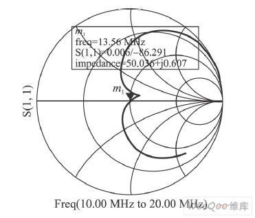 手動調(diào)諧即是交替不斷調(diào)整電容C1、C2 的值,同時觀察曲線變化,直到在所要求的頻率點S11等于0。圖2為某一天線電路在頻率在10~20MHz之間變化時,其反射系數(shù)的變化曲線,其中,標記13. 56MHz的點, S11值近似為0,達到了匹配要求。