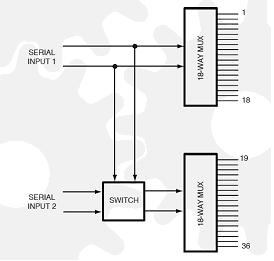 所有的模塊都可以配置成18路的設備。40-735模塊可以配置成兩個18路的多路復用器,從而兩個手機可以由分離的串行接口同時進行控制。40-568電源和傳感模塊多路復用器可以配置為一個18路的設備,進行電源和傳感線路的轉換,兩個這樣的模塊就可以排列成兩個18路的,或是一個單獨的36路多路復用器。