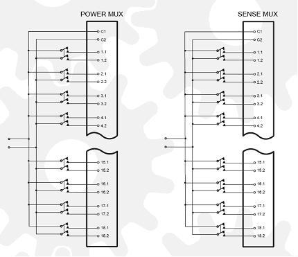 電源和手機之間的距離一般為幾米,因此就會很難將手機中的電池的性能很好地發(fā)揮。采用配有遙感接口的快速反應電源就可以解決這個問題,該遙感即可調節(jié)的是手機上的電壓,而不是電源的輸出端的電壓。需要四根線路來實現(xiàn)這個功能,兩條電源連接線,兩條傳感連接線。這些連接線需要能夠相互轉換,這樣就可以將它們同選定的手機進行連接。這些多路復用器中的兩個可以用來轉換36個手機中的信號。在電源的兩端進行電源切換,這樣就可以保證電纜的故障不會造成地面電流流向測試系統(tǒng)。