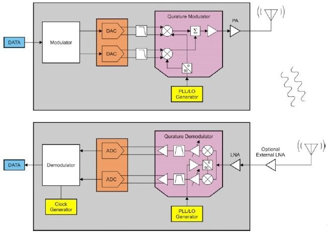 典型的低功耗無(wú)線(xiàn)鏈路由一個(gè)發(fā)送器件和一個(gè)或多個(gè)接收器件組成。發(fā)送器件由一個(gè)調(diào)制器、合成器、升頻混頻器和一個(gè)功率放大器(PA)組成。接收機(jī)由互逆器件、低噪聲放大器(LNA)、降頻混頻器、合成器和解調(diào)器組成。