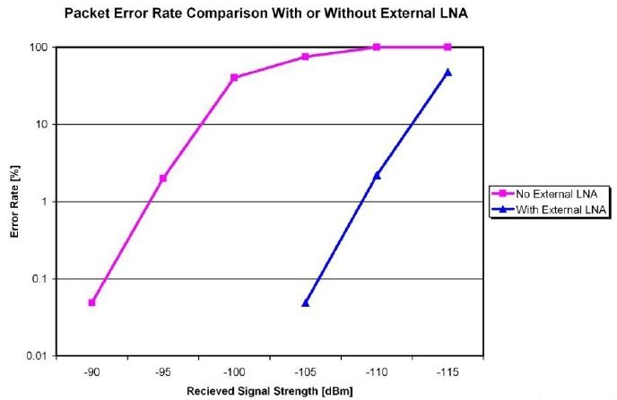 圖2:有/無(wú)外部LNA的低功耗無(wú)線(xiàn)接收機(jī)的誤包率對(duì)比。本例中實(shí)現(xiàn)了15dB的增益改善。