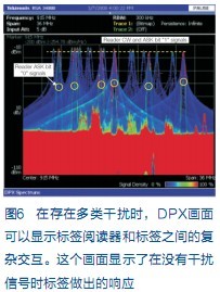 在進行頻率規(guī)劃,把每個閱讀器限定在某條通道(或多條通道)時,可以使用DPX保證調(diào)制邊帶的電平不會在并放閱讀器使用的通道中產(chǎn)生干擾。注意圖6中心的閱讀器和標(biāo)簽信號擁有寬頻譜展寬,駐留時間要長于其它通道。較亮的信號邊緣表明信號密度較高,因此駐留時間較長。這可能會導(dǎo)致鄰道讀取失敗,應(yīng)采取措施,保證閱讀器中的濾波功能足以抗擊這種干擾。