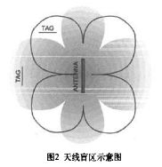 由于環(huán)形天線的電磁場在其臨近區(qū)域分布不均勻,因此會出現(xiàn)讀寫盲區(qū)。如圖2中黑線勾勒出的范圍之外區(qū)域一般為單個天線的讀寫盲區(qū)。經(jīng)反復實驗證明將電子標簽擺放位置轉(zhuǎn)到與最佳位置成40°角區(qū)域時,一般可正常讀寫操作。