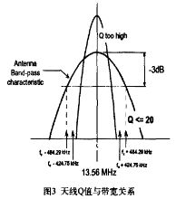 由式(2)可看出,天線的傳輸帶寬B與品質(zhì)因數(shù)Q成反比。因此,過高的品質(zhì)因數(shù)將導致帶寬縮小,降低讀寫器的調(diào)制邊帶信號幅度,導致讀寫器無法與標簽通信。天線Q值與3 dB帶寬的關(guān)系曲線如圖3所示。由圖3可看出:環(huán)形天線與50 Ω的負載相連時,其Q值最好不超過30。為了優(yōu)化天線的性能。讀寫器匹配電路的駐波比應小于1:1.2。