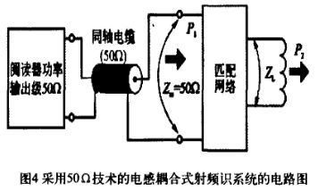 本文研究的RFID讀寫器頻率為13.56 MHz,為有效抑制功率反射、寄生輻射等高頻效應,通常是將讀寫器天線通過同軸電纜連接到讀寫器的高頻模塊,同軸電纜阻抗為50 Ω。因此,天線的阻抗匹配就是通過一定的無源匹配電路來改變讀寫器天線的輸入阻抗,使其與同軸電纜的阻抗保持一致,這樣就可使能量通過同軸電纜幾乎無損失的從讀寫器傳送出去。圖4為采用50 Ω技術(shù)的電感耦合式射頻識別系統(tǒng)電路。