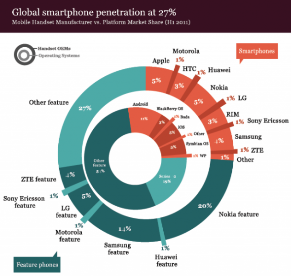 就智能手機(jī)市場(chǎng)領(lǐng)導(dǎo)者而言,當(dāng)前的競(jìng)爭(zhēng)是在iPhone和Android之間展開(kāi)的,原因是前手機(jī)行業(yè)領(lǐng)導(dǎo)者諾基亞對(duì)iPhone的出現(xiàn)反應(yīng)遲緩,因此在高端智能手機(jī)市場(chǎng)上所占份額正在穩(wěn)步下滑。諾基亞已決定從Symbian系統(tǒng)轉(zhuǎn)向Windows Phone系統(tǒng),這一決定不僅令三星、HTC、摩托羅拉、LG和索尼等Android廠(chǎng)商獲得優(yōu)勢(shì),同時(shí)也令華為、中興、宏碁、戴爾和華碩等后來(lái)者受益。