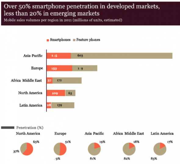 在北美和歐洲市場(chǎng)上,智能手機(jī)滲透率是最高的,在各自市場(chǎng)上所占份額分別為63%和51%。相比而言,亞太地區(qū)、非洲和中東地區(qū)、以及拉美地區(qū),滲透率則要低得多,依次分別為19%、18%和17%。