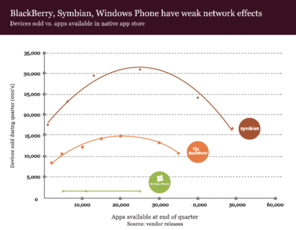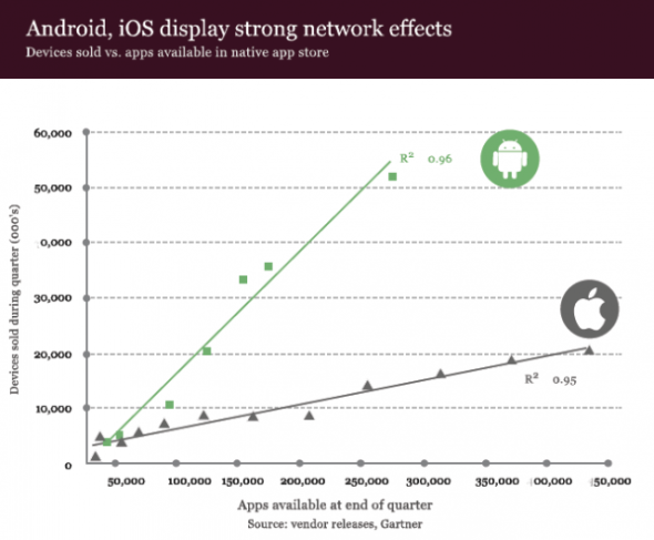 一件有趣的事情是,從手機(jī)應(yīng)用這方面來(lái)看,所有排名靠前的智能手機(jī)廠(chǎng)商的網(wǎng)絡(luò)效應(yīng)都能表明其產(chǎn)品的受歡迎度。以上圖表顯示的是某一特定時(shí)間點(diǎn)在某一特定平臺(tái)上的應(yīng)用數(shù)量,以及這一時(shí)間點(diǎn)以前的一個(gè)季度中該平臺(tái)的手機(jī)出貨量數(shù)據(jù)。由此得出的圖表證明Android和iOS備受歡迎,同時(shí)也表明對(duì)于另一個(gè)競(jìng)爭(zhēng)對(duì)手來(lái)說(shuō),想要成為第三大平臺(tái)有多么困難。