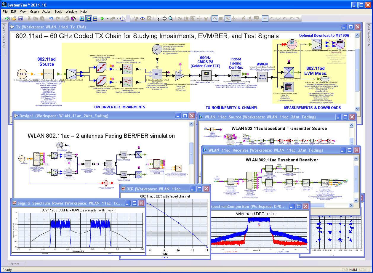 利用這個新程序庫,系統(tǒng)架構師現(xiàn)在可以查看 802.11ac 算法和模型的系統(tǒng)級效率,信號質(zhì)量的預失真、減損、干擾和衰落,以及比特誤碼率。