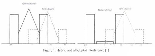 HD無線技術(shù)不需要新的頻譜,因為它可利用現(xiàn)有的AM和FM頻段。在HD無線廣播業(yè)內(nèi),存在混合與全數(shù)字兩種形式?;旌夏J绞窃趦蓚€鄰近邊頻帶上傳輸數(shù)字信號,在兩個頻帶之間播送模擬信號。全數(shù)字模式消除了模擬信道,采用全數(shù)字傳輸。與FM和AM信號獲取相比,在接收這種信號時涉及到大量的數(shù)字信號處理。對于數(shù)字邊頻帶,去除鄰近的模擬信道是必需的(圖1),更復雜的調(diào)制方案涉及到正交頻分復用(OFDM)。