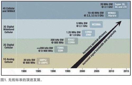 為了解決這一問(wèn)題,無(wú)線(xiàn)提供商轉(zhuǎn)而采用了可提高頻譜效率的無(wú)線(xiàn)標(biāo)準(zhǔn)。這類(lèi)似于將多輛駛往同一目的地的轎車(chē)碼放在一輛卡車(chē)上,并將卡車(chē)沿著高速公路開(kāi)往目的地。這種方法使相同的高速公路上可以實(shí)現(xiàn)更多的數(shù)據(jù)傳輸流量,而不會(huì)導(dǎo)致流量降低。為了提高頻譜效率,我們可部署或定義所有的無(wú)線(xiàn)標(biāo)準(zhǔn),其中包括CDMA2000、W-CDMA、TD-SCDMA、MC-GSM、WiMAX以及LTE等。圖1顯示了近年來(lái)用于提高頻譜效率所部署或定義的無(wú)線(xiàn)標(biāo)準(zhǔn)。