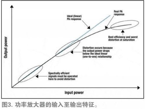 從圖3可以了解PA的工作原理。如藍(lán)線(xiàn)所示,理想的PA具有線(xiàn)性或一對(duì)一響應(yīng)。比如,如果提高10%的輸入功率,那么輸出功率也將相應(yīng)提高10%。而現(xiàn)實(shí)世界中PA的性能如黑色曲線(xiàn)所示,PA性能在輸出功率處于極低水平的情況下與理想的PA一致,而在較高的輸出功率水平下則會(huì)下降至理想PA之下。例如,如果將現(xiàn)實(shí)世界中PA的輸入功率提高10%,其輸出功率僅會(huì)提高9%。因此,即使在輸入功率不斷提高的情況下,PA的輸出功率也將停止上升。