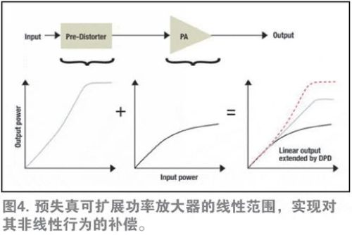自適應(yīng)DPD可以擴(kuò)展寬頻帶射頻(RF)PA的直線(xiàn)性能(straight-line performance),而且遠(yuǎn)遠(yuǎn)超過(guò)正常擴(kuò)展范圍。如前所述,當(dāng)輸出功率增加時(shí),輸出功率與理想線(xiàn)性性能曲線(xiàn)發(fā)生偏離。這正是PA放大輸出信號(hào)出現(xiàn)失真的地方,從而導(dǎo)致信號(hào)質(zhì)量下降及干擾。DPD可將PA失真輸出信號(hào)與非失真輸入信號(hào)進(jìn)行比較。然后,將輸出信號(hào)中一個(gè)與失真正好對(duì)立的信號(hào)添加至輸入,從而有效消除失真。由于DPD可擴(kuò)展PA的線(xiàn)性范圍,因此將其稱(chēng)為線(xiàn)性化技術(shù)(如圖4)。
