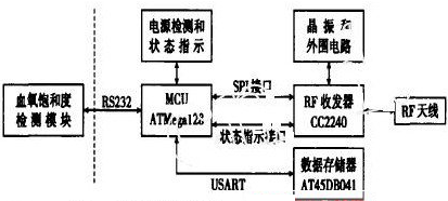 MCU部分是WPAN通信模塊的核心,完成通信模塊各組成部分的控制、協(xié)調(diào)和數(shù)據(jù)的加工。具體功能:通過RS232接口與血氧飽和度檢測模塊通信,實(shí)現(xiàn)對(duì)它的控制和配置,并接收檢測數(shù)據(jù);通過SPI接口和狀態(tài)指示接口實(shí)現(xiàn)對(duì)RF收發(fā)器的配置和檢測,并完成發(fā)射和接收的數(shù)據(jù)交換;通過USART接口與數(shù)據(jù)存儲(chǔ)器連接,完成數(shù)據(jù)存儲(chǔ)器的讀寫操作;通過電源檢測和狀態(tài)指示部分,監(jiān)測電源電壓情況,并能通過狀態(tài)指示產(chǎn)生報(bào)警提示?! ?br />