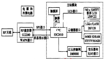 CPU部分完成主站各組成部分的控制、協(xié)調(diào)和數(shù)據(jù)的加工。具體功能:通過系統(tǒng)總線與存儲(chǔ)器相連,完成相關(guān)數(shù)據(jù)的加工、處理和存儲(chǔ);通過LCD接口與彩色液晶顯示器相連,實(shí)現(xiàn)信息的顯示,以實(shí)現(xiàn)人機(jī)交互;通過觸摸屏接口與觸摸屏相連,實(shí)現(xiàn)控制命令的輸入;通過總線接口與以太網(wǎng)控制器相連,可將檢測儀接入后臺(tái)支持網(wǎng)絡(luò),實(shí)現(xiàn)系統(tǒng)信息的集中化管理和與后臺(tái)管理系統(tǒng)的融合;通過SPI接口和狀態(tài)指示接口實(shí)現(xiàn)對(duì)RF收發(fā)器的配置和檢測,并完成發(fā)射和接收的數(shù)據(jù)交換,實(shí)現(xiàn)與檢測儀移動(dòng)終端的通信;通過電源和外圍電路,實(shí)現(xiàn)對(duì)系統(tǒng)的供電。